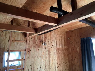 ![]() ![]() ![]() ![]() 築約80年の旧家に残る梁を残しアクセントに。モダンな木目を生かした仕上げにバイアス取りした壁が際立つ |